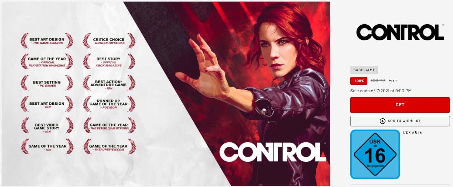 Control is free until 5 PM CET Thursday, June 17th 2021 on Epic Games Store: https://www.epicgames.com/store/en-US/p/control